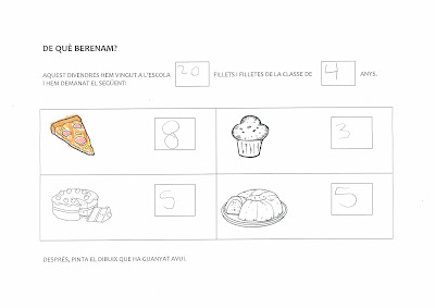 Mireu: hem anotat quants fillets i filletes érem a classe; hem apuntat a una taula la quantitat que hem demanat de cada cosa i després hem pintat el berenar que ha guanyat. I, com és habitual a la nostra classe, ha estat la pizza.